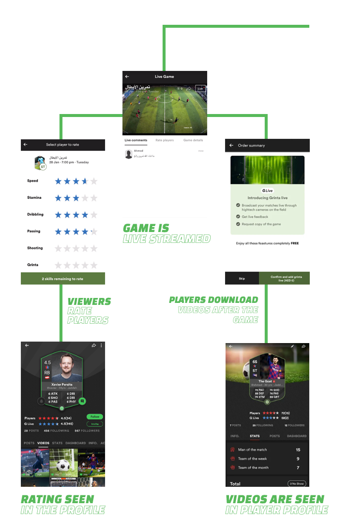 The player browses the fields that offers the live broadcasting service by checking them in the Discover fields page, and after selecting the field and activating the broadcast feature of the match through the application, the payment and activation of the service are carried out.